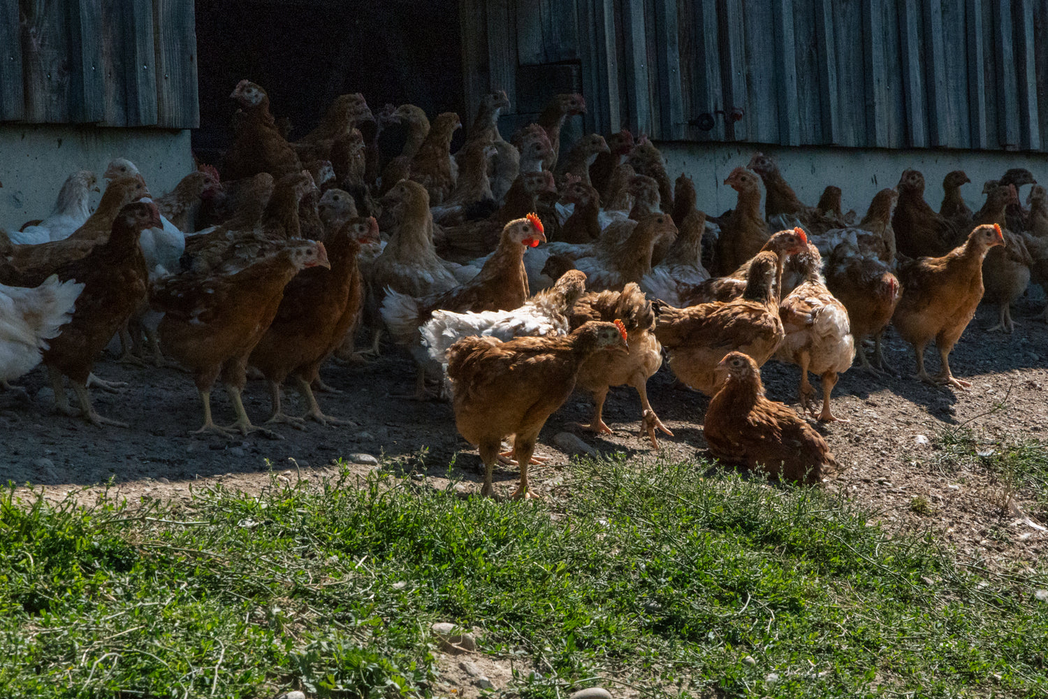 Unsere Mastpoulets haben nicht nur mehr Platz und Auslauf als konventionelle Poulets, ihr Leben dauert auch mehr als doppelt so lange. Die Hühner werden im Alter von 11 Wochen geschlachtet.